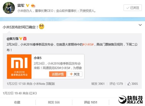 Итак, барабанная дробь – презентация Xiaomi Mi5 состоится 24 февраля. О том, что информация достоверная, сомневаться не приходится. Тем более, что ее чуть позже подтвердил еще один топ-менеджер бренда Лин Бин. Произойдет это уже после того как Samsung анонсирует 21 февраля на открытии MWC 2016 флагман Galaxy S7 с Snapdragon 820. Значит, Xiaomi может замкнуть тройку первых смартфонов с флагманским чипом после LeTV Le Max Pro и Galaxy S7.
