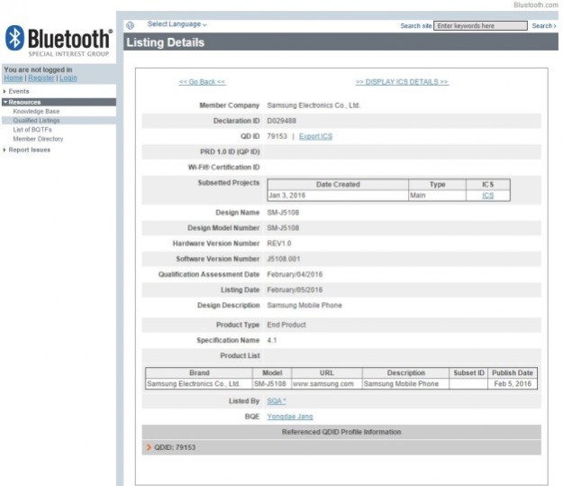 На сайте сертификационной организации Bluetooth SIG были замечены сразу две не анонсированные еще новинки компания Samsung серии Galaxy J (2016) — смартфоны Galaxy J5 (SM-J5108) и Galaxy J7 (SM-J7108).