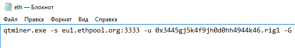 Запускать программу необходимо со специальными параметрами через bat файл (Windows) или скрипт (Linux). В Windows создаем файл с расширением .bat в той же папке где находится qtminer.exe и прописываем в нем следующие параметры:
