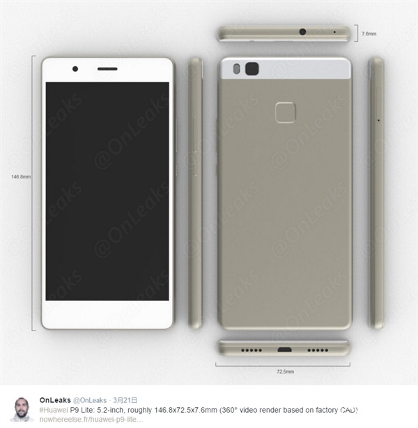 Но на днях в сети появился первый пресс-рендер Huawei P9 Lite и его опубликовал в микроблоге Twitter техно-шпион OnLeaks. Визуальное изучение снимка привело к неожиданному открытию – Lite-версия флагмана придет только с одной тыльной камерой. Похоже, что в погоне за снижением ценника было решено отказаться от одной из ключевых фишек Huawei P9. Сообщил инсайдер и предполагаемые размеры аппарата – 146,8х72,5х7,6 мм.