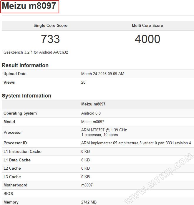 В минувшие дни в базе данных бенчмарка GeekBench были обнаружены результаты тестирования неизвестного смартфона Meizu M8097. Так, в одноядерном тесте аппарат набрал 733 балла, а в многоядерном 4000. Судя по информации бенчмарка, под капотом смартфона работает 10-ядерный МТ6797 с заниженной частотой 1,39ГГц. Обещаемой MediaTek прыти «держите меня семеро» не ощущается. Правда, чип не разогнан на всю мощь, но, возможно, создатели осторожничают из-за нежелания столкнуться с его перегревом или есть проблема с оптимизацией. Из данных бенчмарка мы знаем о присутствии 3 Гб ОЗУ и платформы Android 6.0. С учетом дорожной карты Meizu, это результаты тестирования одного из трех девайсов Meizu Blue Charm 2, MX6 или его mini-версии.