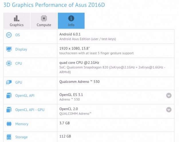 Zenfone 3 (Z016D), проходивший тестирование в GFXBench, работает под управлением операционной системы Android 6.0.1 Marshmallow. Официальный анонс смартфона запланирован на 30 мая.