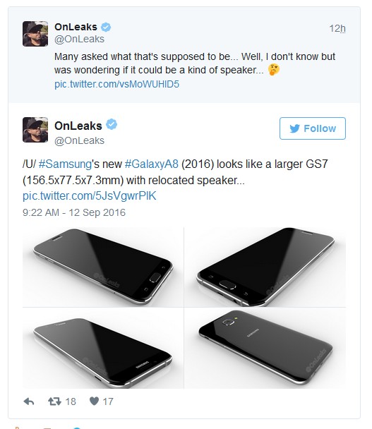 Согласно многочисленным утечкам информации, Galaxy A8 (2016) получит 5.1-дюймовый экран, фирменный 8-ядерный процессор Exynos 7420 с частотой 2.1 ГГц и графикой Mali-T760 MP8, 3 ГБ оперативной памяти и 32 ГБ встроенной, а также 5Мп фронтальную камеру и 16Мп основную. Как видим, устройство будет на одну ступеньку ниже Galaxy S7 в иерархической модели умных телефонов Samsung.