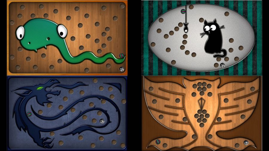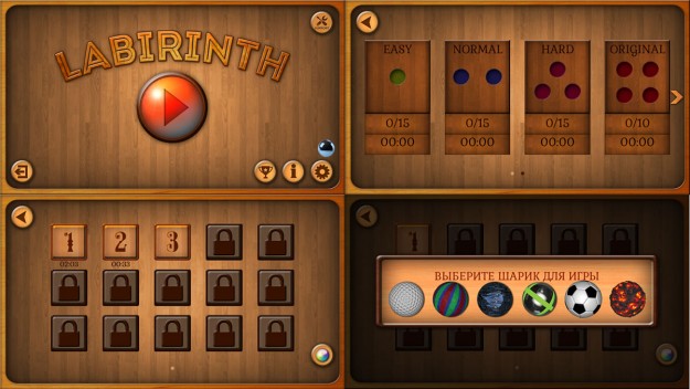 Игровая карта Labirinth на базовых уровнях выглядит просто. Это деревянная подложка с перегородками и лунками. Советуем попробовать разные шарики, так как двух одинаковых там нет ни по цвету, ни по характеристикам. Они отличаются скоростью передвижения, силой отскока от бортиков и своей маневренностью.