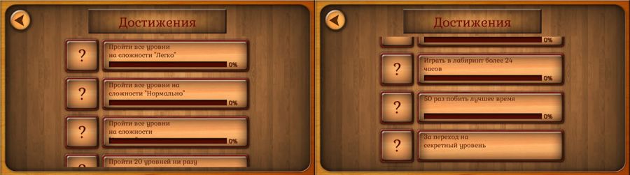 Данный раздел доступен с основного экрана приложения. Здесь вместо подсчетов в уме будет вестись некоторая статистика: учет уровней, когда вы ни разу не попали в лунку, количество попаданий в лунку и особое празднование этого действия на 1000-й раз, заходы в секретный уровень, подсчет времени до наступления первых 24 часов проведенных в Labirinth и др.