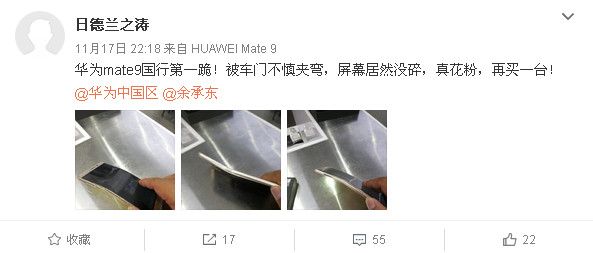 Как утверждает владелец Huawei Mate 9, он случайно повредил новенький девайс во время неудачного закрытия входной двери дома. Что любопытно – корпус смартфона согнулся, а вот дисплей остался цел и невредим. Такое чувство, что китайцы установили в девайсе изогнутый экран, способный проявить чудеса гибкости. Правда, остался ли после этого испытания аппарат в строю, не сообщается.