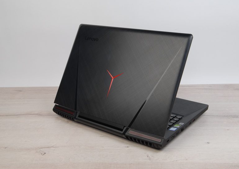 IdeaPad Y900-ISK — это крупный, 17-дюймовый ноутбук с толщиной корпуса 36 мм. Вес модели составляет почти 5 кг, поэтому вопрос портативности здесь относителен. Все коммуникации сосредоточены на боковых гранях. На левой стороне вы найдете порт для зарядки, светодиодный индикатор состояния аккумулятора, DisplayPort, HDMI 2.0, LAN-порт, USB Type-C с поддержкой Thunderbolt, пару USB 3.1. Правая грань собрала на себе пару стандартных USB 2.0, аудиопорты, индикаторы активности диска и кардридер. На нижней панели вместе с сабвуфером находятся воздухозаборники и вентиляционные отверстия системы охлаждения. К устойчивости ноутбука на поверхности никаких претензий нет, за это отвечает как большой вес, так и 4 крупных резиновых ножки.
