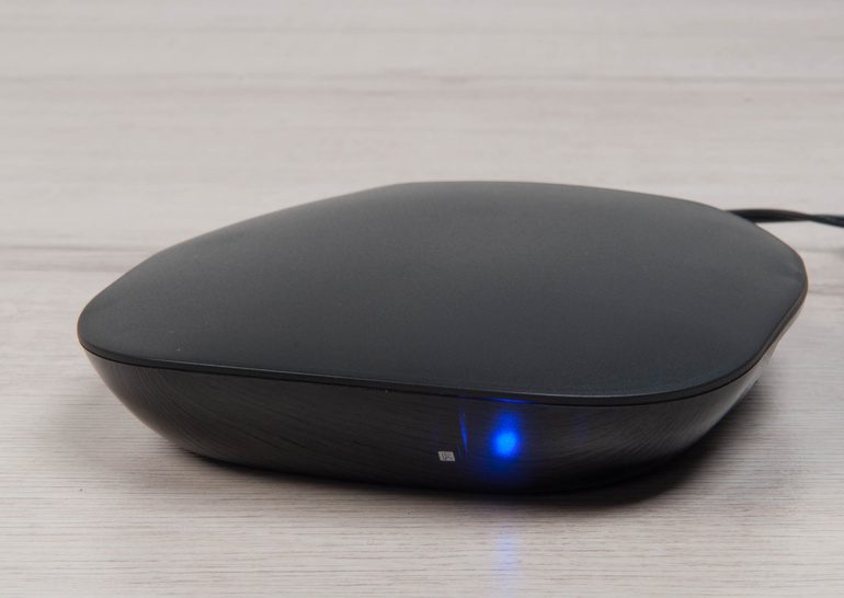 Второй пульт (Air Mouse) – гироскопический. Он еще меньше, корпус – полностью глянцевый (отпечатки пальцев появляются моментально). Для связи с плеером используется отдельный ресивер, подключаемый к порту USB (находится под крышкой батарейного отсека). Кнопок на нем самый минимум (регулировка громкости, навигация по пунктам меню, кнопки мыши, возврат домой, вызов меню и т.д.) – но их на самом деле более чем достаточно для управления плеером в Android TV. С эргономикой у пульта все в порядке: в руке он лежит удобно, кнопки находятся в пределах досягаемости и нажимаются легко и отчетливо.