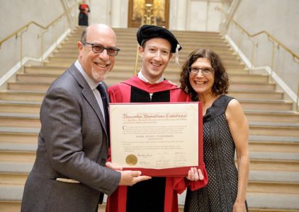 На церемонии вручения дипломов Цукерберг произнес торжественную речь, в ходе которой заявил, в частности, что родители гордятся им в первую очередь за поступление в Гарвард.