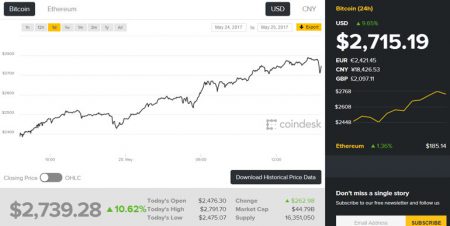По данным биржи Coindesk в ходе торгов 25 мая стоимость одного Bitcoin поднималась до максимального значения $2791,70. Рыночная капитализация Bitcoin превысила $44,9 млрд. За последние 5 дней криптовалюта Bitcoin прибавила более четверти стоимости.
