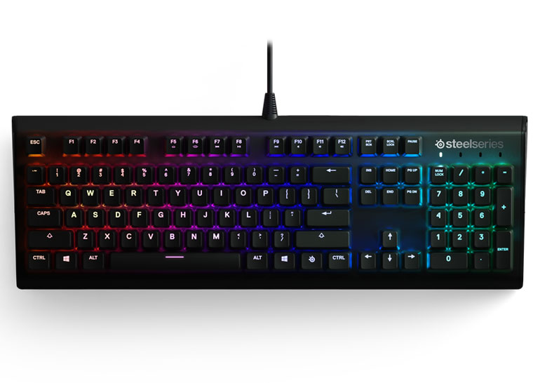 Устройство оснащено механическими переключателями SteelSeries QX2, для которых заявлен ресурс в 50 млн нажатий. Клавиши имеют ход 4 мм, а точка срабатывания расположена на середине хода. Клавиатура работает достаточно тихо. Для каждой клавиши используется собственная многоцветная RGB LED подсветка, которая может быть запрограммирована на отображение различных световых уведомлений для различных событий. Иными словами, пользователь может настроить световые эффекты различных цветов и длительности при получении сообщений электронной почты, сообщений в мессенджерах и т.д. Фирменное приложение SteelSeries Engine позволяет настраивать работу клавиатуры, выводить внутриигровые уведомления, а также поддерживает интеграцию с мессенджером Discord.