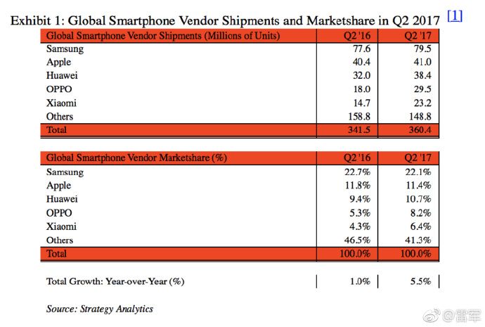 Недавно обнародованный отчет исследовательской компании Strategy Analytics показал стремительный рост продажи смартфонов компании Xiaomi во втором квартале 2017 года, что привело к возвращению производителя в топ-5 брендов по реализации устройств. Данная информация была опубликована генеральным директором Xiaomi в китайской сети Weibo. Похоже, компания начинает возвращать себе утраченные ранее позиции и постепенно восстанавливает свою долю на рынке. Так, в начале прошлого месяца были подведены итоги поставок всех отгруженных смартфонов компании, что в общей сложности составляет 23,2 млн. проданных единиц. Вследствие этого Strategy Analytics установила о занимаемой пятой позиции компанией среди прочих топовых производителей на рынке реализованных мобильных устройств, где доля Xiaomi составляет 6.4%.